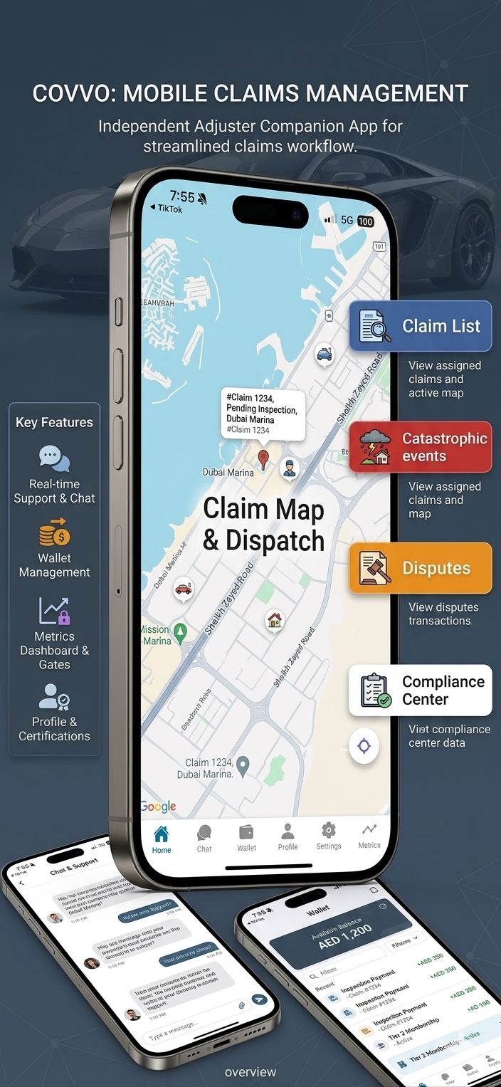 React Native mobile app for insurance adjusters to manage claims, track compliance, handle wallet & membership, view real-time metrics with eligibility gates, chat with support, add state licenses & certifications, and manage their profile.